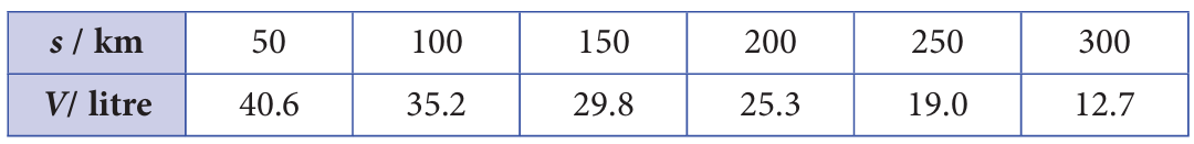 A driver wants to know the petrol consumption per km of a car in a journey of 300 km at constant speed. He installed a measuring device to record the remaining volume of petrol at every 50 km interval from the starting point. Table 4 shows the readings obtained.
